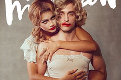 На обложке журнала знаменитости запечатлены в светлых кудрявых париках и с красной помадой на губах. При этом Паттинсон одет в белую майку, украшенную кружевами и маленьким бантом.