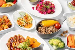 В меню класса «Бизнес», в зависимости от направления и времени вылета, пассажирам предложат: спринг-роллы с овощами и кисло-сладким соусом, винегрет и тортилью с хрустящими овощами, печеный баклажан с маринованным цукини, тыквой и перцем-гриль, с луковым соусом; постную лазанью из баклажанов; фрукты на десерт и другое.