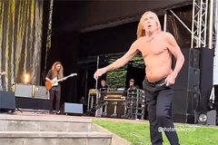 78-летний музыкант вышел на открытую сцену в одних черных брюках и вельветовых ботинках. При этом его длинные светлые волосы были распущены.