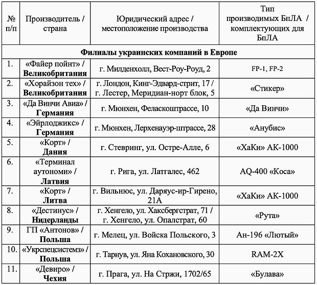 Так, в список вошли 11 филиалов украинских компаний, расположенных в Великобритании, Германии, Дании, Литве, Латвии, Нидерландах, Польше и Чехии. На них производятся беспилотники типов «Лютый», «Анубис», «Да Винчи», «Булава», «Стикер», FP-1, FP-2, «ХаКи» АК-1000, AQ-400 «Коса», «Рута» и RAM-2X.