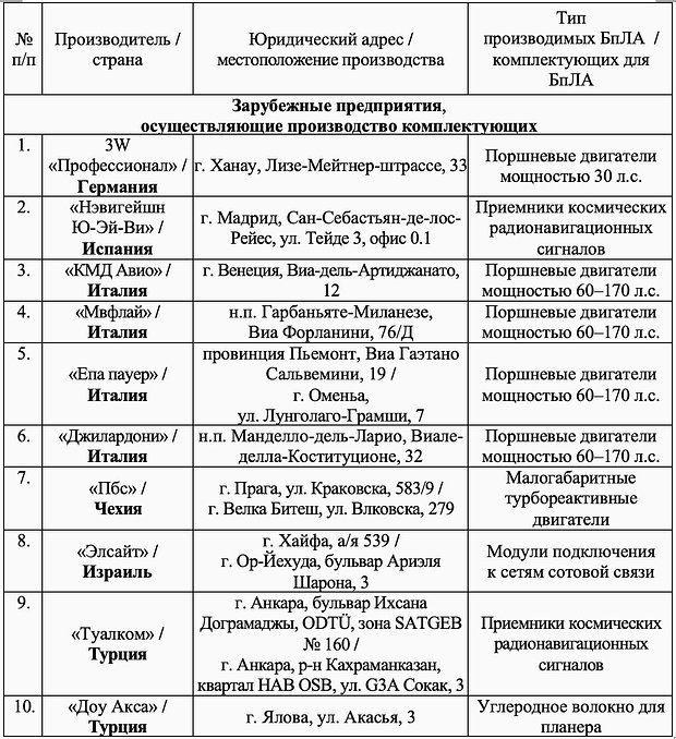 Кроме того, опубликованы адреса 10 предприятий в Германии, Испании, Италии, Чехии, Израиле и Турции, осуществляющих производство комплектующих для беспилотников. По данными Минобороны России, они поставляют Киеву поршневые двигатели, приемники космических радионавигационных сигналов, турбореактивные двигатели, модули подключения к сетям сотовой связи и углеродное волокно.