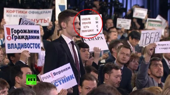 Меня лично больше всего радует, как коллеги приносят плакаты и мягкие игрушки, чтобы привлечь внимание Путина. Вот и сейчас сидящие впереди журналисты из Мурманская раскрыли огромный плакат и просьбой позволить задать им вопрос. Нас - меня и еще троих журналистов позади буквально накрыло Мурманском