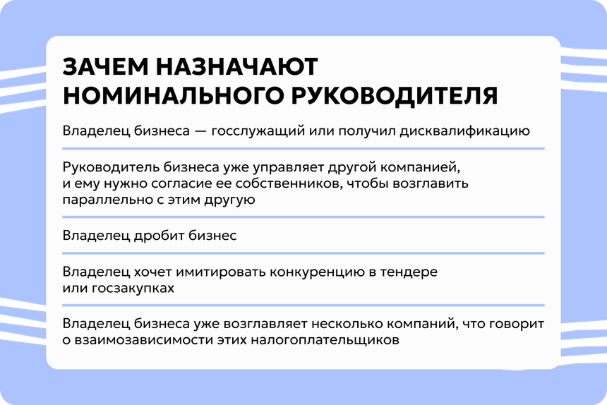 Если реальный владелец бизнеса не хочет по каким-то причинам афишировать свои связи с конкретной компанией, он может зарегистрировать ее на номинального держателя или оформить номинального руководителя. То есть того, кто на практике никак не участвует в управлении, а порой и в бизнес-процессах в целом. Максимум от него попросят формально присутствовать на важных встречах.