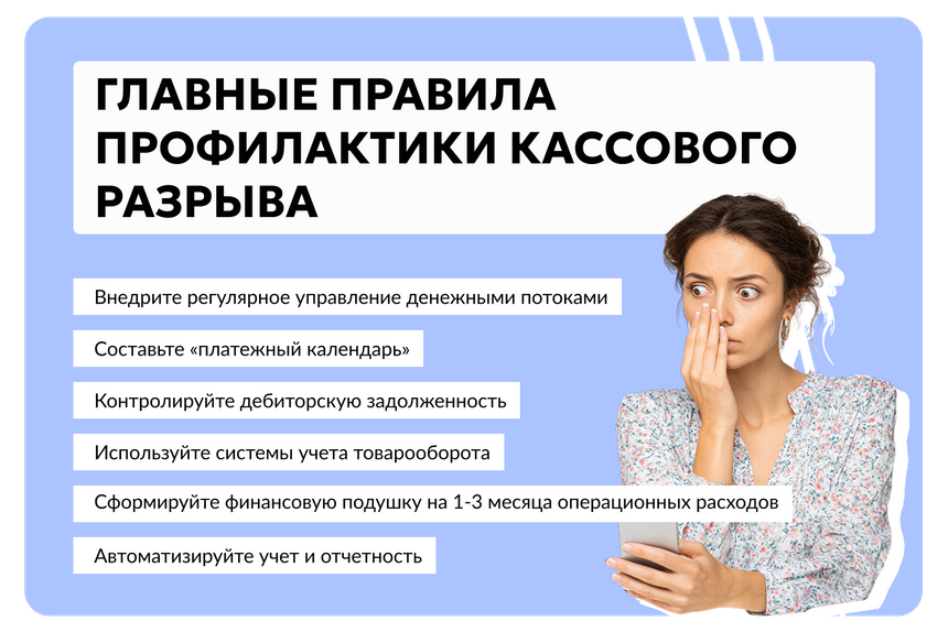 Кассовый разрыв говорит о том, что где-то в компании не уделили достаточного внимания контролю за финансовыми потоками и не позаботились об их планировании — или совершили ошибки в процессе. Даже очень успешный бизнес может внезапно не совместить доходы и расходы. Поэтому главная защита от кассовых разрывов — в прозрачности движения денег, жесткой финансовой дисциплине и качественном прогнозировании продаж, расходов и доходов.