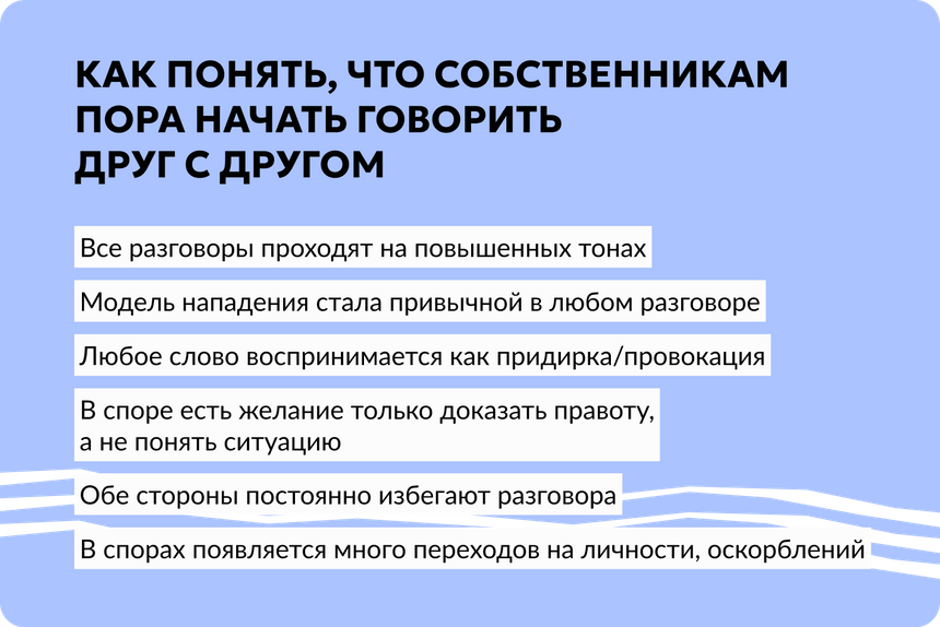 | Несовпадение целей или путей их достижения | Договариваться об общих целях и обсуждать движение к ним — либо расходиться, если ключевые цели собственников диаметрально противоположные |