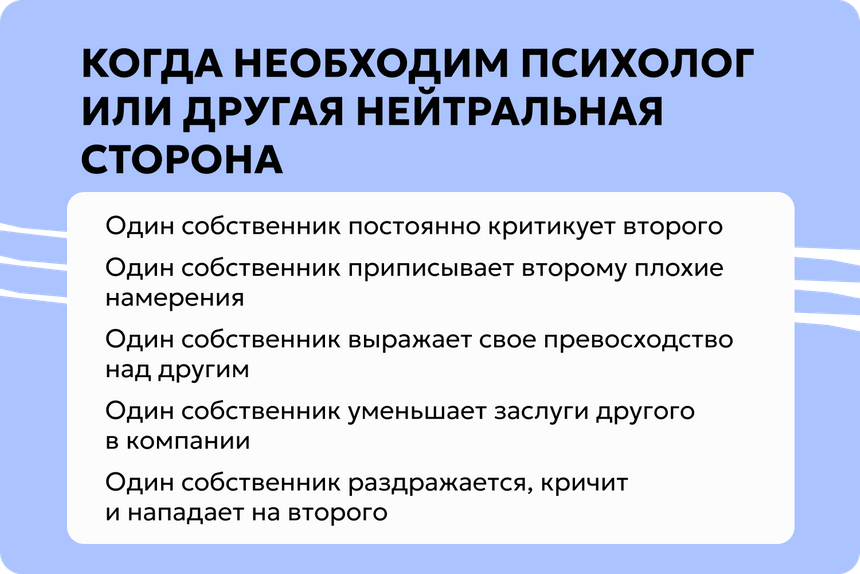 Два собственника — это два лидера и равных партнера (независимо от распределения долей), которые решили заняться одним делом. Это равенство должно сохраняться и в конфликте.