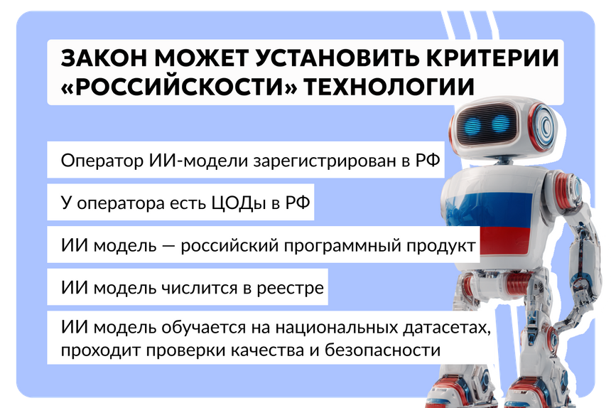 Цель нового закона — ввести базовые понятия для рынка, чтобы исключить разночтения в регулировании, например, у разных ведомств. Потенциально будет затрагивать не саму технологию ИИ, а произведенные с ее использованием продукты. Поскольку избыток госрегулирования «может привести к утрате технологического лидерства».