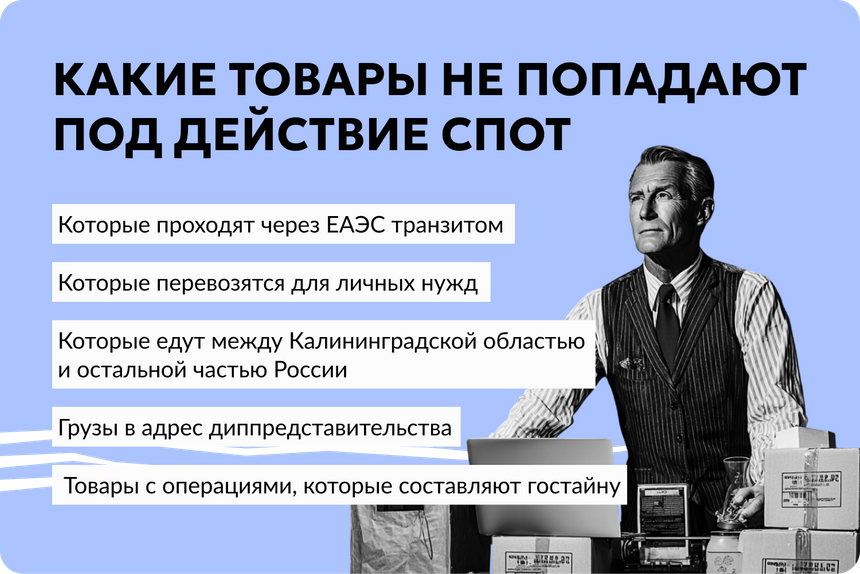 • Под действие СПОТ подпадут товары, которые ввозятся в Россию для продажи физлицам через электронные торговые площадки. Отнесение товаров к «для личного пользования» будет определять контролирующий орган СПОТ — исходя из характера и количества товаров, а также способа их покупки.