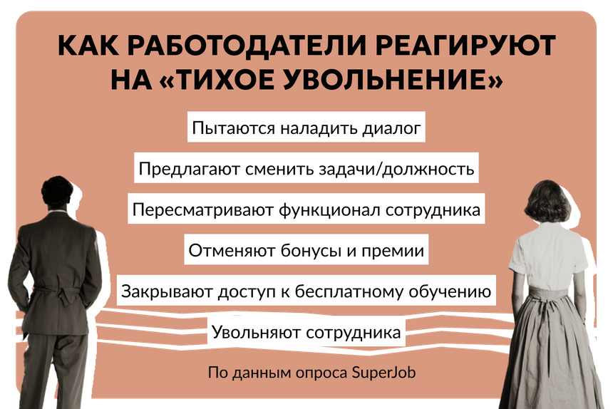 Такой подход не обнулит вероятность «тихого увольнения», но позволит снизить риски и контролировать ситуацию.   «Тихое увольнение» — неприятная и даже опасная для бизнеса ситуация: он может начать терять деньги из-за падения продуктивности «потухшего» сотрудника. Если вы столкнулись с этим, важно понять причину происходящего и с холодной головой решить, стоит ли реанимировать работника или это только затянет ожидание перед реальным увольнением.