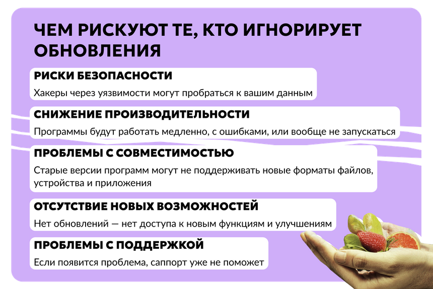 Также обновления помогают в исправлении проблем с совместимостью программ и устройств. Если вы не обновляете систему, то можете столкнуться с тем, что некоторые приложения или периферийные устройства начнут работать с ошибками или вообще перестанут поддерживаться.