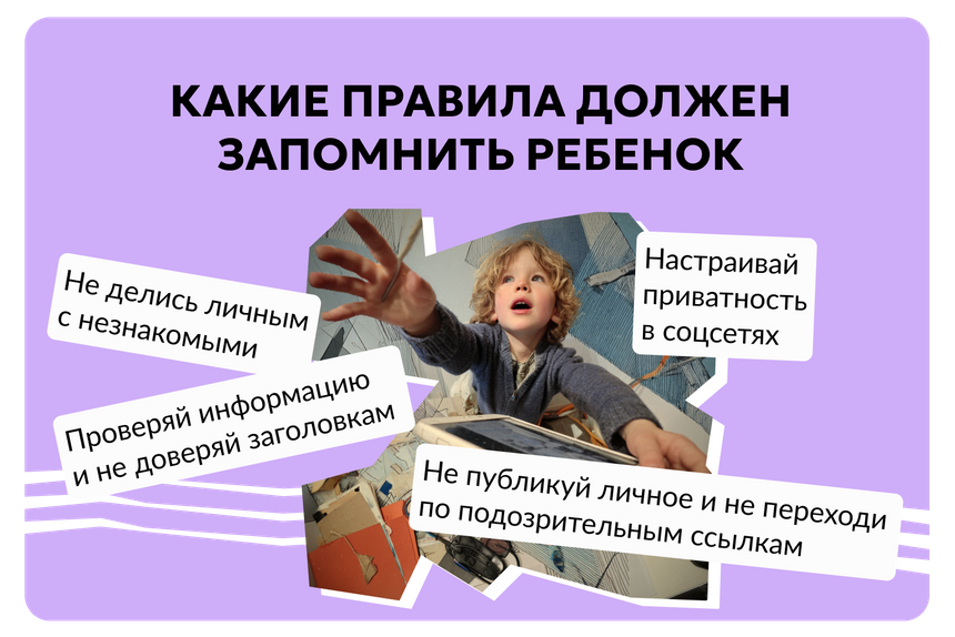 Важно научить ребенка обдуманно расставлять границы в соцсетях и не вводить данные на случайных сайтах.