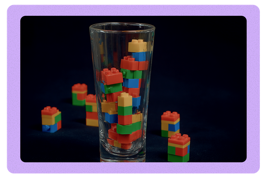 А теперь представьте стакан, который мы наполняем кубиками лего. Мы можем вместить туда много кубиков, но не можем просто так положить туда полкубика или четверть кубика. А еще эти кубики и этот стакан настолько маленькие, что могут спрятаться в мельчайшей капле воды из первого стакана. Примерно на таком уровне действуют квантовые частицы.