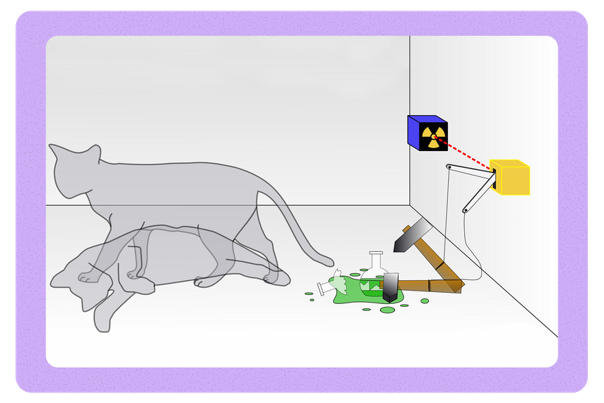 Экспериментатор предложил поместить в закрытый ящик кота, радиоактивный атом в процессе полураспада и счетчик Гейгера, который при полном распаде атома зафиксирует превышение радиоактивного фона и разобьет молоточком колбу с ядом. При этом известно время примерного полураспада атома, но неизвестно время полного распада.