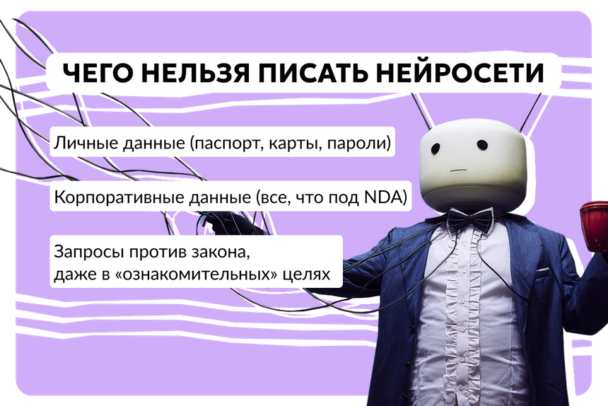Также не стоит использовать в переписке с нейросетями личные данные, особенно третьих лиц. Это может быть расценено как незаконное оперирование персональными данными, ведь в случае с иностранными моделями они передаются на серверы иностранных же компаний без информированного согласия на это человека.