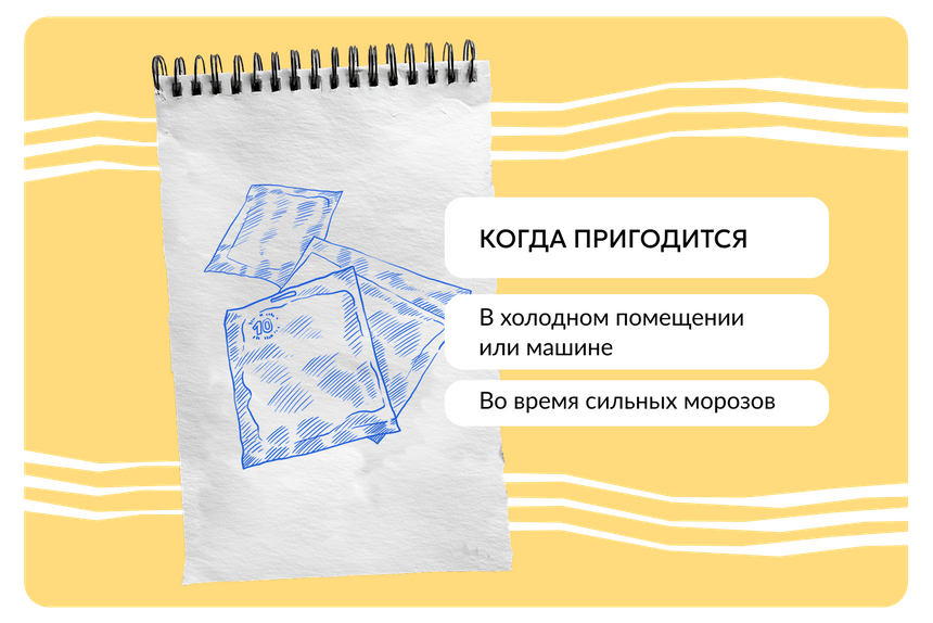 Теплоид — это небольшой пакет с химическими реагентами. Если надавить на него как следует или согнуть упаковку, внутри запускается химическая реакция. В результате такая грелка начинает выделять тепло.