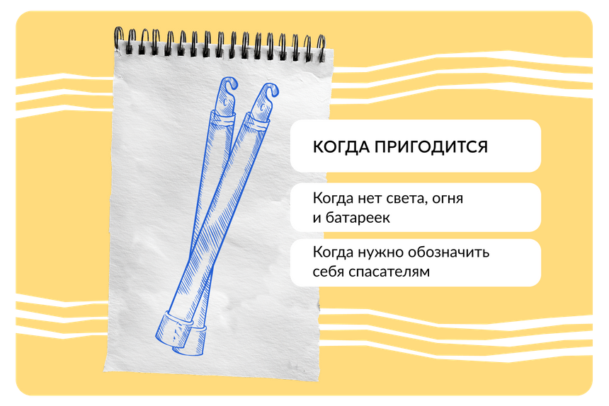 Это пластиковые палочки, которые после надламывания и встряхивания начинают светиться за счет химической реакции. Работают 8–12 часов, не нагреваются и не гаснут под дождем.