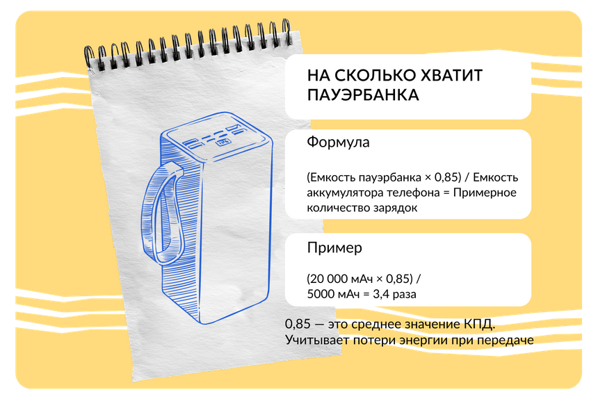 Выбирайте емкость не менее 20 000 мАч — этого хватит на 3–4 полные зарядки смартфона.