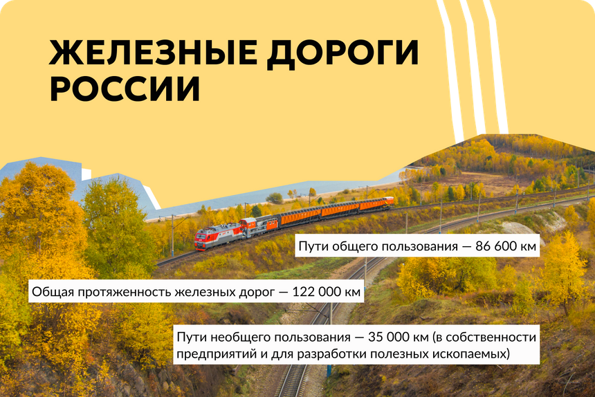 По протяженности железных дорог Россия занимает третье место в мире (122 000 км), уступая США (293 564 км) и Китаю (155 000 км).