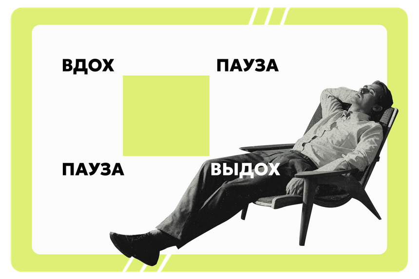 В этом поможет техника дыхания «квадратом». Суть ее в том, чтобы делать одинаковые по времени вдохи и выдохи с паузами после каждого.