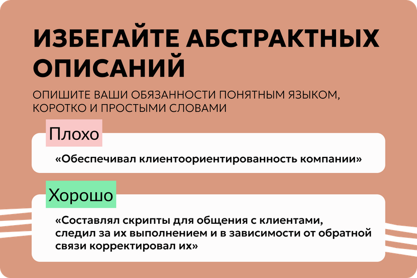 Стоп-слова. Не пишите банальности (целеустремленный и коммуникабельный) и размытые фразы (квалифицированный с большим опытом).