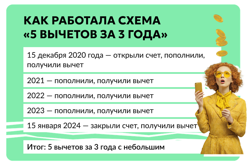 Раньше среди инвесторов был популярен один трюк: открыть ИИС в конце декабря, а закрыть через 3 года и 1 месяц в январе. Формально счёт действовал чуть больше трёх лет, но «захватывал» пять календарных годов. Это позволяло получить не три, а целых пять налоговых вычетов.