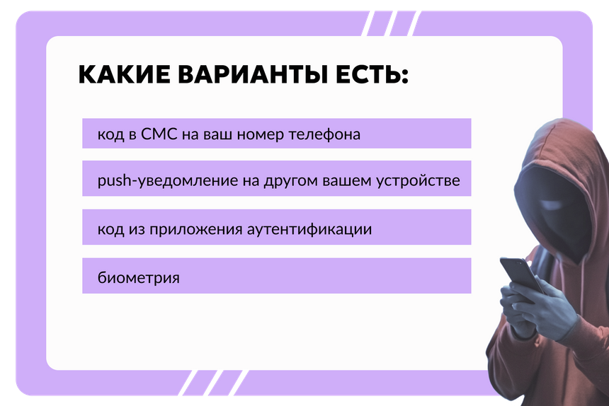 Двухфакторная аутентификация — это способ проверки пользователя в два этапа. К стандартным логину и паролю добавляется что-то еще — например, код из СМС. Даже если злоумышленник получит доступ к устройству, имея только один компонент из двухфакторки, он все равно не сможет войти в систему или конкретные приложения.