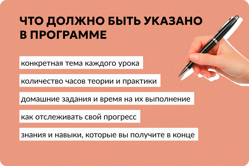 Совет: обязательно сравните планы разных онлайн-курсов по теме, которая вам интересна. Так вы шире сможете взглянуть на тему в целом и сделать правильный выбор