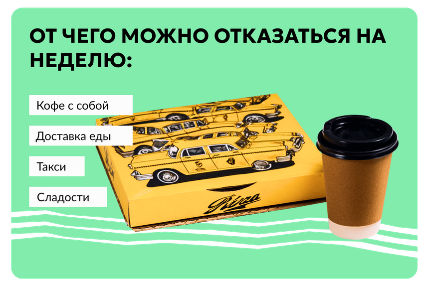 Эта активность поможет вам осознать свои траты и попутно сэкономить. Для этого нужно выбрать любую категорию ваших необязательных трат и отказаться от них на неделю.