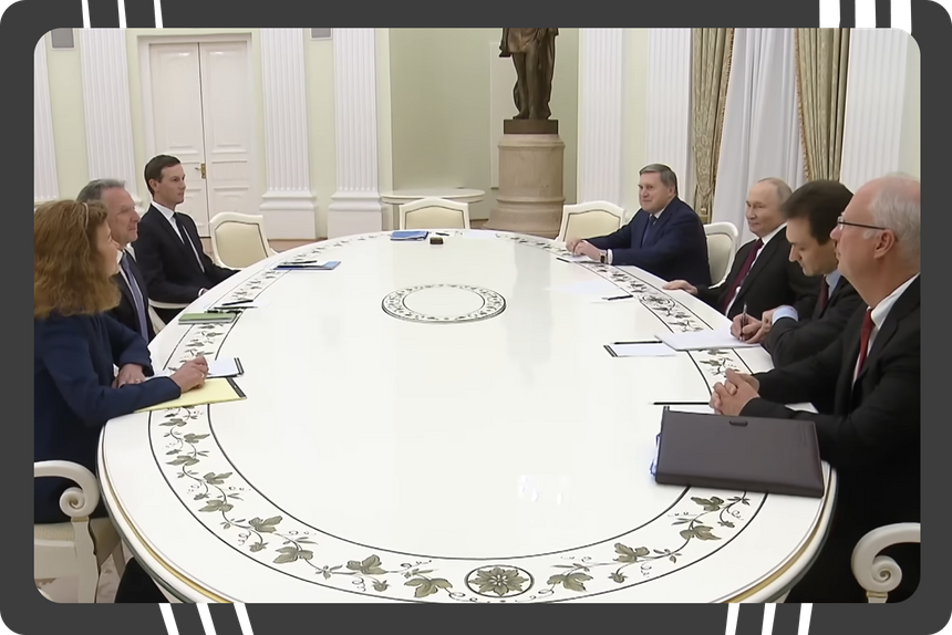 Переговоры длились пять часов. С американской стороны в них участвовали спецпосланник Трампа Стив Уиткофф и зять президента Джаред Кушнер, а с российской — президент Владимир Путин, его помощник Юрий Ушаков и глава РФПИ, спецпредставитель президента России по инвестиционно-экономическому сотрудничеству с зарубежными странами Кирилл Дмитриев.