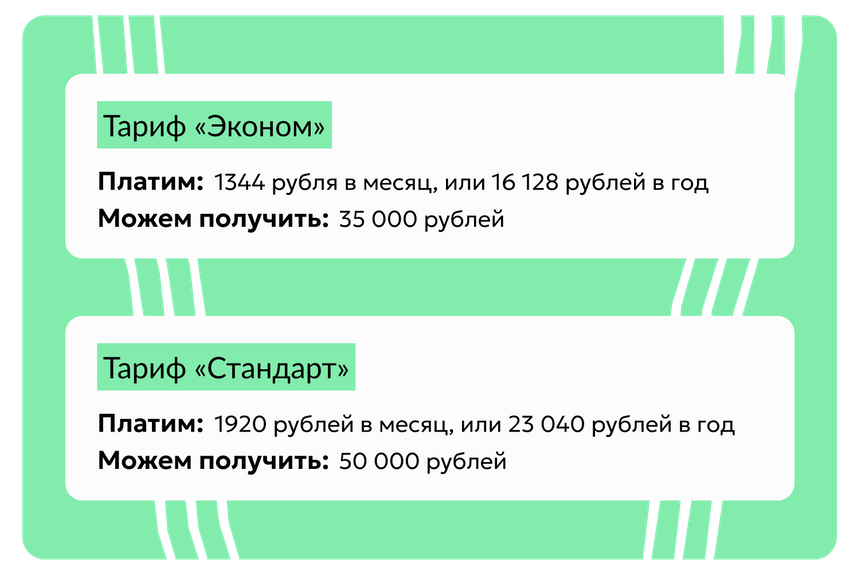 - Взнос: 1920 рублей в месяц. Страховое покрытие: 50 000 рублей.