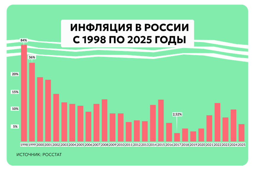 Но оно сильно завышено из-за последствий дефолта (рост цен в 1998 году составил 84,44 и 36,56% — в 1999-м). Если исключить эти два кризисных года и посчитать среднюю инфляцию в XXI веке (с 2000 по 2025 год), значение составит 9,48%.