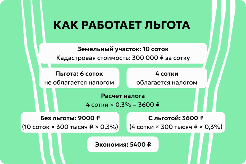 Экономия зависит от кадастровой стоимости земли (это стоимость участка, установленная государством) и налоговой ставки, которую каждый регион устанавливает сам.