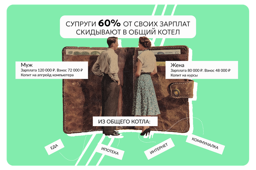 Это самая популярная модель ведения семейного бюджета в России. Оба супруга складывают все заработанное в «общий котел». Неважно, кто сколько заработал, — все деньги становятся общими. Из этого же котла оплачиваются все расходы, от коммуналки до похода в кино.