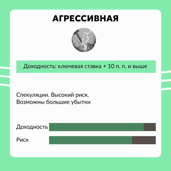 Агрессивная. Для готовых к риску. Здесь торговля фьючерсами (контрактами, обязывающими купить или продать актив (например, нефть, акции) в будущем по заранее оговоренной цене) и акциями малоизвестных компаний, биржевые спекуляции. На этом можно быстро заработать, но и потерять тоже, причем немало. Нужны крепкие нервы и готовность к убыткам.