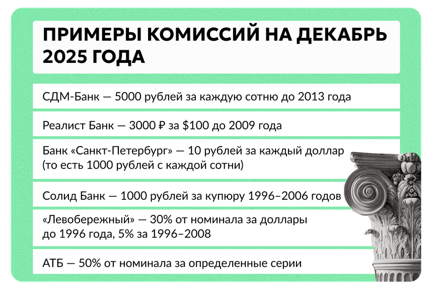 Сбербанк и ВТБ принимают старые доллары без специальной комиссии за «старость». В ВТБ есть стандартная комиссия 300 рублей при операции менее $300 — но это для любых купюр. Газпромбанк, Альфа-банк, МКБ, Фора-банк — также без дополнительных сборов за год выпуска.