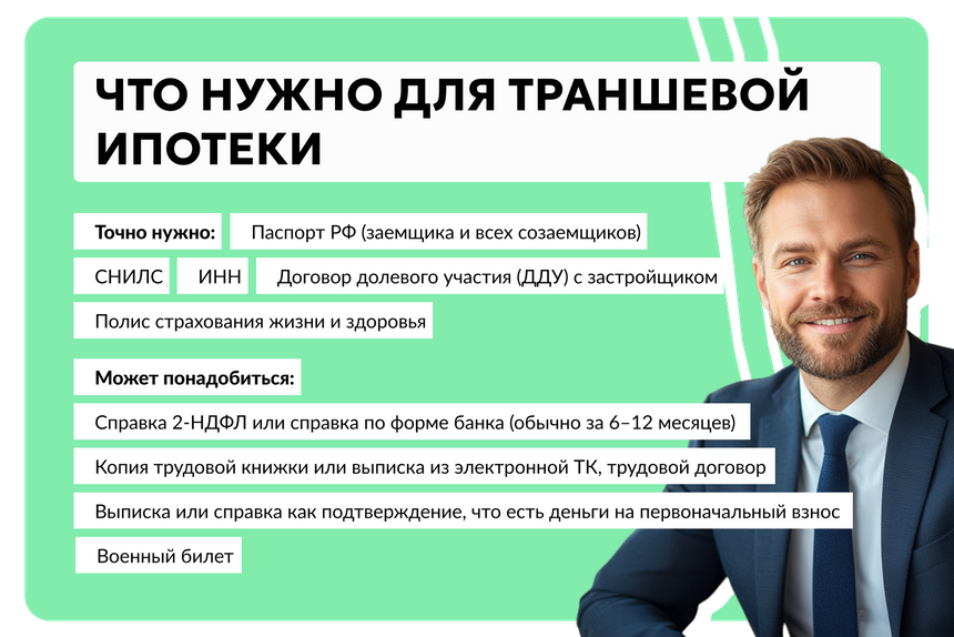 Пакет документов для траншевой ипотеки практически идентичен классической ипотеке. Но есть один важный нюанс — дополнительно потребуются документы по объекту строительства (ДДУ, информация о застройщике).