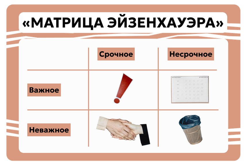 Рассортировать задачи по приоритету поможет матрица Эйзенхауэра. Согласно ей, все дела можно распределить по четырем категориям — важное и срочное, неважное и срочное, важное и несрочное и неважное и несрочное. Это позволит понять, какую задачу нужно запускать в работу немедленно.