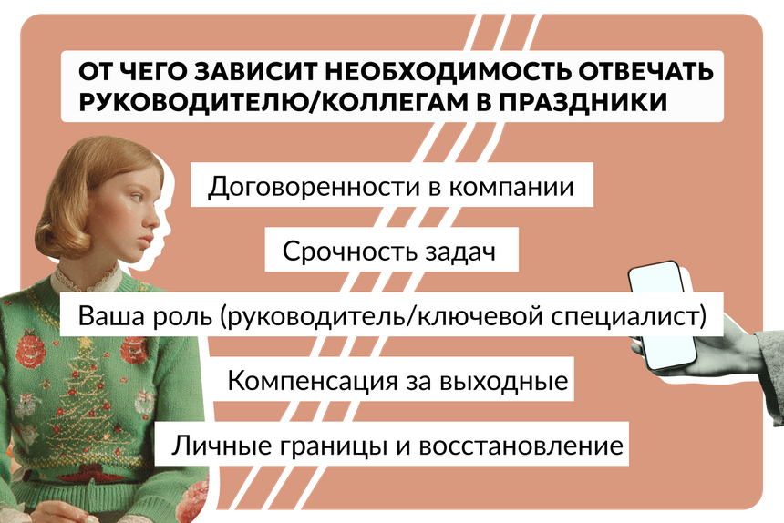 Резюмируем: в большинстве отраслей выходные и праздники — время, когда можно законно отдыхать и не видеть в глаза рабочие чаты, лица коллег и руководителя. Но на практике даже в условном дизайн-бюро могут возникать задачи, которые требуют быть на связи. Если ситуация экстренная и никто кроме вас ее не решит, лучше все же ответить. А если вы планируете отдых с «цифровым детоксом», просто обговорите это с руководителем.