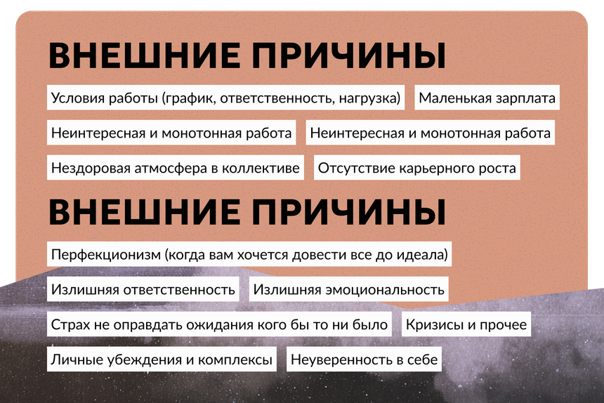 Психологи разделяют все причины эмоционального выгорания на две крупные категории — внешние и внутренние. Первые обычно связаны с работой или учебой, а вторые — с личными качествами человека.