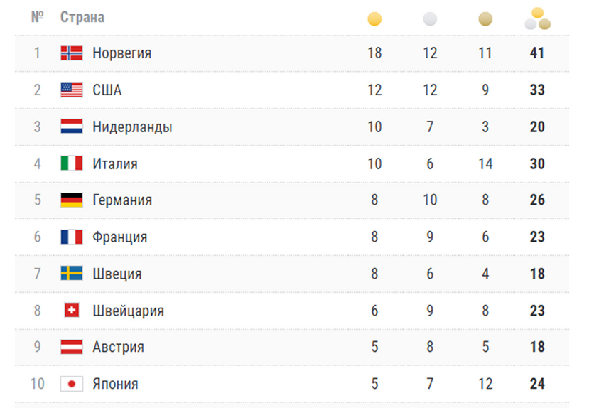 Норвегия выиграла медальный зачет, завоевав 41 медаль на Олимпиаде. При этом скандинавы забрали 18 золотых наград — просто сумасшедший результат!